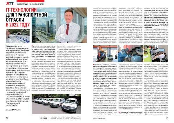 Как известно , после 24 февраля из-за санкционных ограничений , равно как и проблем с логистикой , российская IT-отрасль и потребители услуг специализированного программного обеспечения , в том числе применяемого на коммерческом транспорте , столкнулись с серьезными проблемами . В числе прочего , например , это связано с уходом из России компании « Gurtam », к платформе мониторинга которой было подключено почти 3,3 миллиона объектов . Разумеется , появились проблемы и с практикой использования ОЕМ-решений грузовиков европейской « Большой семерки »... Пояснить ситуацию любезно согласился Дмитрий Журавлев , управляющий партнер Группы компаний « MONTRANS ».