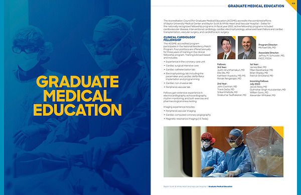 The Accreditation Council for Graduate Medical Education ( ACGME ) accredits the combined efforts of Baylor University Medical Center and Baylor Scott & White Heart and Vascular Hospital – Dallas for the nationally recognized fellowship programs . In fiscal year 2022 , active fellowship programs included cardiovascular disease , interventional cardiology , cardiac electrophysiology , advanced heart failure and cardiac transplantation , vascular surgery , and cardiothoracic surgery .