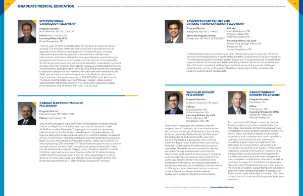 This one-year ACGME-accredited training program accepts one fellow annually . The program offers a broad-based learning experience in all aspects of interventional cardiology with clinical training in coronary interventional procedures , peripheral interventions , valvular heart interventions , and structural heart procedures . Experience and training in a longitudinal ambulatory clinic are also included as part of the fellowship . Advanced percutaneous interventions include balloon angioplasty , coronary stenting , CTO interventions , intravascular ultrasound , rotational atherectomy , thrombectomy , distal protection devices , IVUS , and pressure wire evaluation . In addition to peripheral interventions , valvular heart interventions include TAVR , percutaneous mitral valve repair and mitral balloon valvuloplasty . Structural heart interventions consist of ASD , PFO , PDA , and LAA closures . The Baylor Scott & White Heart and Vascular Hospital – Dallas cardiac catheterization laboratory performs more than 2,500 diagnostic cardiac procedures per year and more than 1,400 PCIs per year .