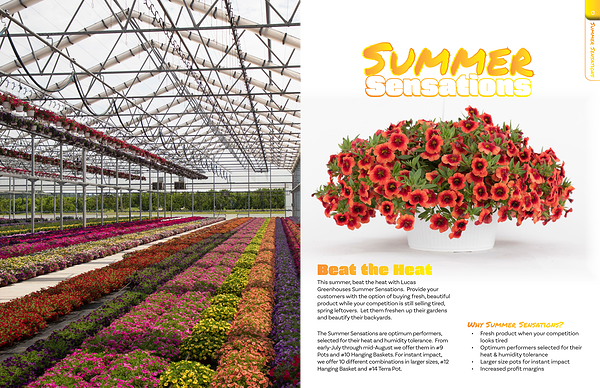 This summer , beat the heat with Lucas Greenhouses Summer Sensations . Provide your customers with the option of buying fresh , beautiful product while your competition is still selling tired , spring leftovers . Let them freshen up their gardens and beautify their backyards .
