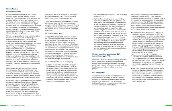 In FY22 we established an ESG and Climate Advisory growth platform , bringing thought leadership together to address decarbonization and resiliency advisory services and implementation for clients , with cross-connections throughout our Infrastructure , Power , Environmental and Digital business units . This coordinated approach leverages the full Company ’ s knowledge and resources to cover a broad array of climate challenges . We also established an ESG SteerCo to help guide TRC ’ s climate strategy moving forward .