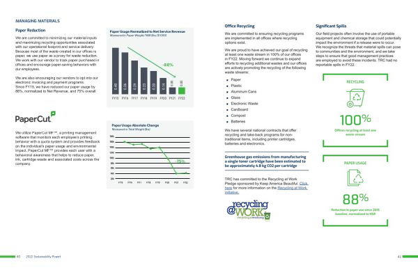 Our field projects often involve the use of portable equipment and chemical storage that could potentially impact the environment if a release were to occur . We recognize the threats that material spills can pose to communities and the environment , and we take steps to ensure that good management practices are employed to avoid these incidents . TRC had no reportable spills in FY22 .