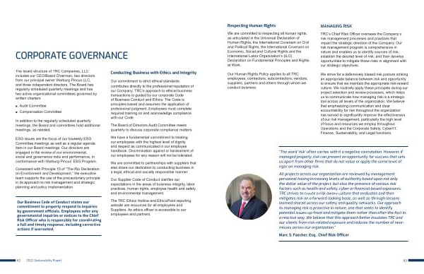Our commitment to strict ethical standards contributes directly to the professional reputation of our Company . TRC ’ s approach to ethical business transactions is guided by our corporate Code of Business Conduct and Ethics . The Code is principles-based and assumes the application of professional judgment . Employees must complete required training on and acknowledge compliance with our Code .
