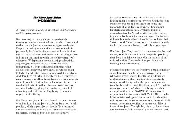 Feelings of isolation are too typically a mutual ordeal for young Jews , particularly those encompassed in a religiously diverse society . Identity is a predominant conflict of mine , with my political stance constantly compromised . Every end of the spectrum spews and preaches Jew-hatred . From the classic fascist “ go back to where you came from ” slander for being “ not white enough ”, or that in fact “ 6MWE ” ( 6 million wasn ’ t enough merchandise seen at 2021 Capitol Riots ), to the leftist ‘ antizionist disguise ’ that we are in fact the white nationalists ( a sentiment so antisemitic to demand middleeastern , government conflicts be any responsibility of international Jews ). Xenophobia , bigotry , a losing battle with intolerance . Whatever your personal disputes with