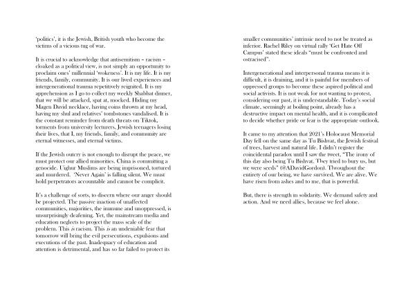 It came to my attention that 2021 ’ s Holocaust Memorial Day fell on the same day as Tu Bishvat , the Jewish festival of trees , harvest and natural life . I didn ’ t register the coincidental paradox until I saw the tweet , “ The irony of this day also being Tu Bishvat . They tried to bury us , but we were seeds ” (@ ADavidGordon ). Throughout the entirety of our being , we have survived . We are alive . We have risen from ashes and to me , that is powerful .