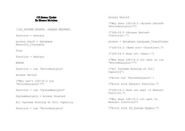 function = run ‘ SystemAnalysis ’ SystemAnalysis = Access Granted All Systems Running at Full Capacity function = run ‘ ErrorAnalysis ’