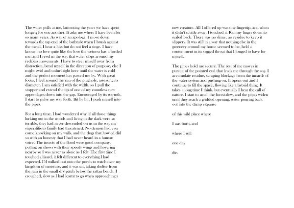 The water pulls at me , lamenting the years we have spent longing for one another . It asks me where I have been for so many years . As way of an apology , I move down towards the tap end of the bathtub : when I brush against the metal , I hear a hiss but do not feel a singe . I have known no love quite like the love the wetness has afforded me , and I revel in the way that water slops around my reckless movements . I have to steer myself away from distraction , bend myself in the direction of purpose , else I might swirl and unfurl right here until the water is cold and the perfect moment has passed me by . With great focus , I feel around the rim of the plughole , assessing its diameter . I am satisfied with the width , so I pull the stopper and extend the tip of one of my countless new appendages down into the gap . Encouraged by its warmth , I start to pulse my way forth . Bit by bit , I push myself into the pipes .
