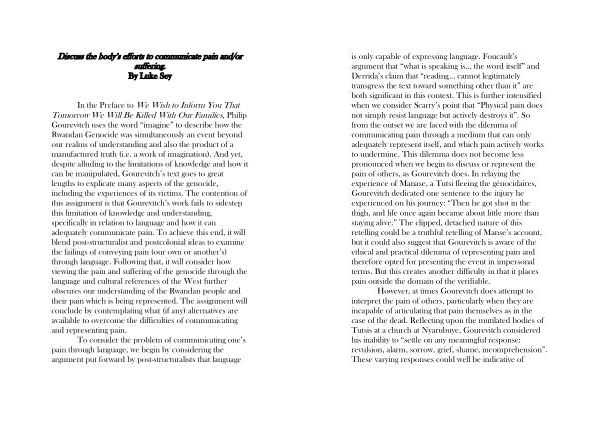 In the Preface to We Wish to Inform You That Tomorrow We Will Be Killed With Our Families , Philip Gourevitch uses the word “ imagine ” to describe how the Rwandan Genocide was simultaneously an event beyond our realms of understanding and also the product of a manufactured truth ( i . e . a work of imagination ). And yet , despite alluding to the limitations of knowledge and how it can be manipulated , Gourevitch ’ s text goes to great lengths to explicate many aspects of the genocide , including the experiences of its victims . The contention of this assignment is that Gourevitch ’ s work fails to sidestep this limitation of knowledge and understanding , specifically in relation to language and how it can adequately communicate pain . To achieve this end , it will blend post-structuralist and postcolonial ideas to examine the failings of conveying pain ( our own or another ’ s ) through language . Following that , it will consider how viewing the pain and suffering of the genocide through the language and cultural references of the West further obscures our understanding of the Rwandan people and their pain which is being represented . The assignment will conclude by contemplating what ( if any ) alternatives are available to overcome the difficulties of communicating and representing pain .