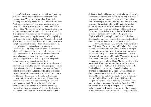 definition of cultural hegemony explains how the idea of European identity and culture was historically constructed to be perceived as superior “ in comparison with all the non-European peoples and cultures .” Therefore , in using language , which is both informed by and informs that culture , Gourevitch cannot help but compromise his representations . Moreover , the legacy of the constructed European identity informs , according to McMillan , the decision to render narratives about the genocide in English , which “ is not simply a marketing choice but a discriminatory discursive practice that facilitates the global dominance of a culturally particular perspective .”