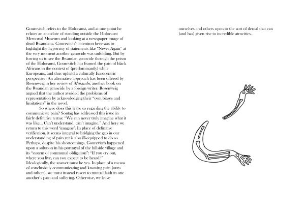 Gourevitch refers to the Holocaust , and at one point he relates an anecdote of standing outside the Holocaust Memorial Museum and looking at a newspaper image of dead Rwandans . Gourevitch ’ s intention here was to highlight the hypocrisy of statements like “ Never Again ” at the very moment another genocide was unfolding . But by forcing us to see the Rwandan genocide through the prism of the Holocaust , Gourevitch has framed the pain of black Africans in the context of ( predominantly ) white Europeans , and thus upheld a culturally Eurocentric perspective . An alternative approach has been offered by Rosenweig in her review of Murambi , another book on the Rwandan genocide by a foreign writer . Rosenweig argued that the author avoided the problems of representation by acknowledging their “ own biases and limitations ” in the novel .