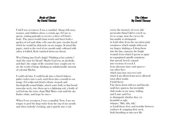 Until I was seventeen , I was a cannibal . Along with men , women , and children above a certain age , I ’ d rise to queue , waiting patiently to receive a sliver of Christ ’ s body . The priest would chant words and burst forth a garden of red and white cells onto the pure circular bread which he would lay delicately on my tongue . It tasted like paper , stuck to the roof of my mouth until , softened with saliva , it folded , flesh vanished down my throat .