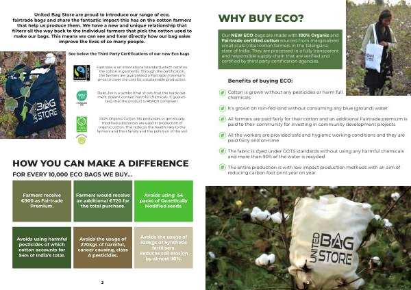 Our NEW ECO bags are made with 100 % Organic and Fairtrade certified cotton sourced from marginalised small scale tribal cotton farmers in the Telengana state of India . They are processed in a fully transparent and responsible supply chain that are verified and certified by third party certification agencies .