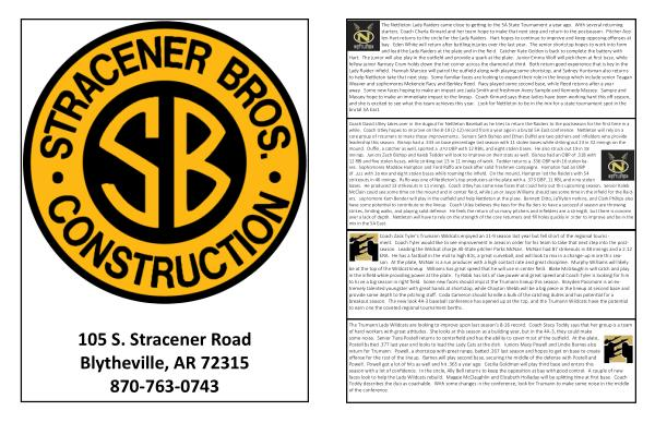 Coach Zack Tyler ’ s Trumann Wildcats enjoyed an 11-9 season last year but fell short of the regional tournament . Coach Tyler would like to see improvement in areas in order for his team to take that next step into the postseason . Leading the Wildcat charge All-State pitcher Parks McNair . McNair had 87 strikeouts in 38 innings and a 2.12 ERA . He has a fastball in the mid to high 80s , a great curveball , and will look to mix in a change-up more this season . At the plate , McNair is a run producer with a high contact rate and great discipline . Murphy Williams will likely be at the top of the Wildcat lineup . Williams has great speed that he will use in center field . Blake McGlaughlin will catch and play in the infield while providing power at the plate . Ty Robb has lots of raw power and great speed and Coach Tyler is looking for him to have a big season in right field . Some new faces should impact the Trumann lineup this season . Brayden Passmore is an extremely talented youngster with great hands at shortstop , while Chayton Webb will be a big piece in the lineup at second base and provide some depth to the pitching staff . Coda Cameron should handle a bulk of the catching duties and has potential for a breakout season . The new look 4A-3 baseball conference has opened up at the top , and the Trumann Wildcats have the potential to earn one the coveted regional tournament berths .