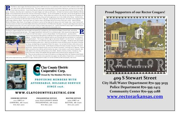 The Rector Cougars battled their way through a very good 2A-3 conference , into a third place Region 3 North finish , and all the way to the state quarterfinals last year . The Cougars would finish 18-8 and 9-3 in conference play . With several returning starters back , Coach Robbie Dorman ’ s bunch looks to match last season ’ s success and go deeper into the postseason . Several starters return to the lineup providing plenty of experience this upcoming season led by All-State pitcher Cooper Rabjohn . The Best Under the Sun selection will be one of the best pitchers and hitters in a conference full of good players . The Cougars will be tough to beat when Rabjohn is on the mound . His battery mate Drew Hendeerson is considered by many the top catcher in the league . Henderson bats left-handed and has tremendous plate vision . Brett Fair and Kameron Jones are likely to bat in the heart of the Rector lineup , and big things are expected of them this season . Fair will play first base , while Jones will be at second and on the mound some . Daniel Romero will play third base and play a key part in the pitching rotation . Romero has good velocity , and if he remains consistent , could step up in a big way . Center fielder and pitcher Evan Holmes will be another key piece in the rotation as will Landon Haywood , who adds depth to the pitching staff and plays some infield . Rabjohn , Romero , Holmes , Henderson , Haywood , and Jones create a formidable pitching rotation that could be hard for opponents to handle . They can also produce a lot of pop at the plate as can designated hitter Sam Shipley and left fielder Jackson Hill . The 2A-3 looks to be a gauntlet once again , but with plenty of experience , a strong pitching staff , and an explosive lineup , the Rector Cougars looked poised to make a run at the conference title and possibly even more .