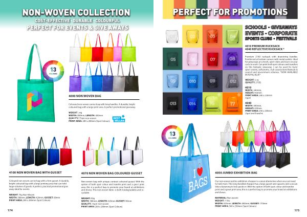 MATERIAL : Non woven WEIGHT : 110g WIDTH : 525mm , LENGTH : 400mm , GUSSET : 170mm PRINT AREA : 300 x 250mm ( Spot Colours )