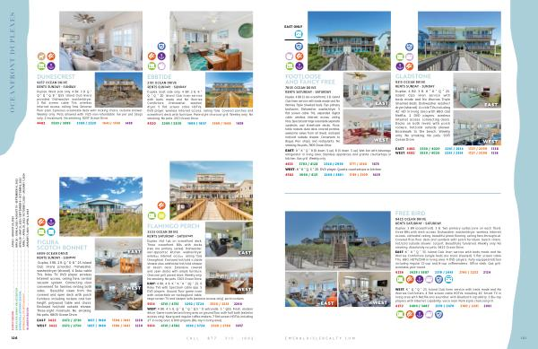 Duplex , West side only . 4 BR , 3 B . Q * Q * Q * Q , B * QSS . Island Club linens provided . Dishwasher , washer / dryer , 2 flat screen cable TVs , wireless Internet access , ceiling fans . Reverse floor plan . Spacious oceanside deck with rocking chairs , outside shower . Weekly only . Pets allowed with $ 125 non-refundable fee per pet ( dogs only , 2 maximum ). No smoking . 9257 Ocean Drive .