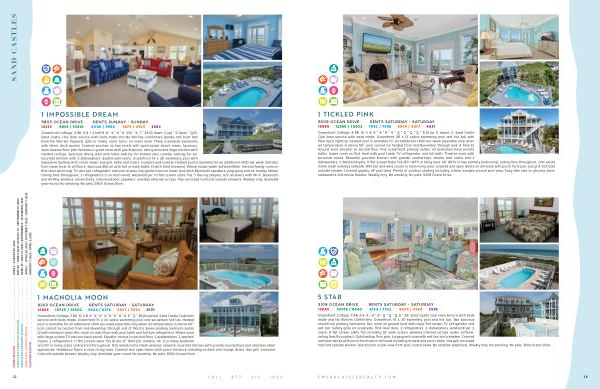 Oceanfront Cottage , 7 BR , 10 ½ B . K * K * K * K * K * K * K * K , D * Q * 2B ( Doubles ). Sand Castle Club linen service with beds made . Oceanfront 15 ’ x 34 ’ saline swimming pool and six person hot tub . Heated pool is available for an additional $ 600 per week ( operable only when air temperature is above 60 °; pool cannot be heated from mid-November through end of March ). Seven primary bedroom suites ( 2 with whirlpool tubs ). Rec room on main floor with pool table and full-size refrigerator . Media room with large screen TV and surround sound . Elevator access to second floor . 2 dishwashers , 2 washer / dryers , 2 refrigerators , 11 flat screen cable TVs ( 9 are 37 ” DVD / LCD combos , 46 ” in primary bedroom and 60 ” in living area ), ceiling fans throughout . Orbi whole home mesh wireless network . Gourmet kitchen with granite countertops and stainless steel appliances . Hardwood floors in main living area . Covered and open decks with porch furniture including rockers and lounge chairs . Gas grill , enclosed hot / cold outside shower . Weekly only . Available year-round . No smoking . No pets . 9263 Ocean Drive .