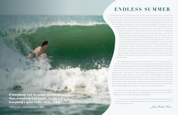 Isn ’ t that what every beach trip still means to all of us ? Are we not slipping into a warm Gulf Stream of memory and consciousness where we feel every day spent at the beach is mystically an infinity of endless summer days ? We remember wistfully the grandmothers and aunties no longer among us that brought big bowls of watermelon slices out to our beach chairs , which we ate thirstily , juice dripping perfectly onto wet bathing suits . Then gazing out beyond the breakers where our sons and daughters , nieces and nephews , and now for me , my grandsons and granddaughters are the ones bobbing on surfboards , waiting expectantly for just the perfect moment to paddle , then gracefully spring to their feet , crouch , balance and take that sweet ride as far as the wave will carry them . Just this summer our five-year-old grandson John learned from his sixteenyear-old brother Justin how to finesse his way to catch a wave , just as his older brother Mark had once taught Justin . Surfin ’ U . S . A . right here on Emerald Isle ’ s shore .
