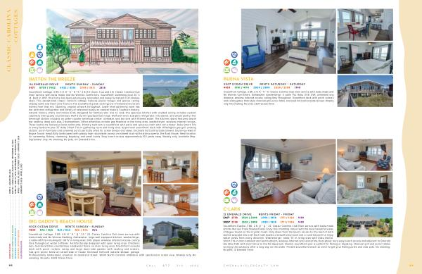 Oceanfront Cottage , 5 BR , 4 B . K * K * Q * 2S * 2S . Classic Carolina Club linen service with beds made and No Worries Bedding . Dishwasher , large well-equipped kitchen , washer / dryer , 3 cable HDTVs including 60 ” HDTV in living area , DVD player , wireless Internet access , ceiling fans throughout , water softener . Architecturally designed with open living area . Children ' s den . Granite kitchen countertops . Hardwood floors on main living area . Oceanfront covered deck with porch rockers , swing and large dune-side gazebo with seating and rockers . Gas grill , picnic table on street-side of house . Enclosed hot / cold outside shower , garage . Professionally landscaped , situated on dead-end street . Warm North Carolina ambiance with spectacular ocean view . Weekly only . No smoking . No pets . 6303 Ocean Drive .
