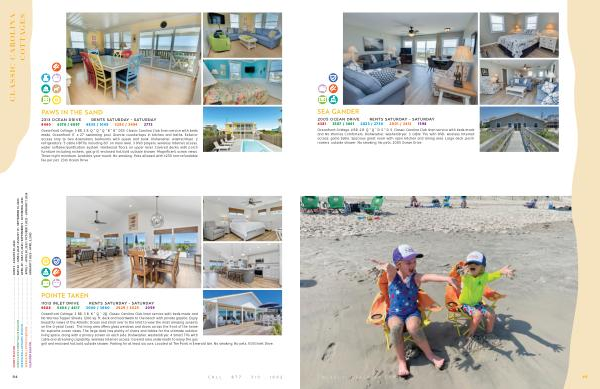 Oceanfront Cottage , 4 BR , 2 B . Q * Q * D , S * D , S . Classic Carolina Club linen service with beds made and No Worries Comforters . Dishwasher , washer / dryer , 3 cable TVs with DVD , wireless Internet access , game table . Spacious great room with open kitchen and dining area . Large deck , porch rockers , outside shower . No smoking . No pets . 2005 Ocean Drive .