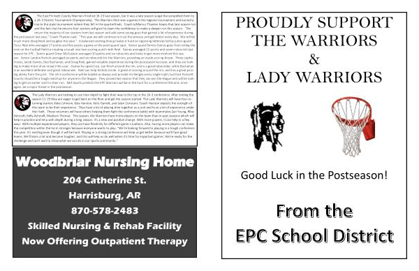 . The East Poinsett County Warriors finished 16-15 last season , but it was a late season surge that propelled them to a 2A-3 District Tournament Championship . The Warriors then won a game in the regional tournament and earned a trip to the state tournament where they fell in the quarterfinals . Coach JeMarcus Thaxton hopes that late season run and the fact that he returns four starters will give his team the confidence to make a deeper run this season . “ We return the majority of our starters from last season and add some young guys that gained a lot of experience during the postseason last year ,” Coach Thaxton said . “ This year we will continue to trust the process and get better every day . We will be much more disciplined and tougher this year .” A balanced starting lineup makes it hard on opposing defenses led by junior guard Tyrus Reel who averaged 17 points and five assists a game at the point guard spot . Senior guard Dennis Gaines goes from toting the rock on the football field to creating a tough one-two scoring punch with Reel . Gaines averaged 15 points and seven rebounds last season for EPC . Senior guard Omar McCuiston averaged 10 points and six rebounds and looks to get more involved this season . Senior Landon Nichols averaged six points and six rebounds for the Warriors , providing an inside scoring threat . Three sophomores , Jacob Gaines , Dee Buchanan , and Doug Reel , gained valuable experience during the postseason last year , and they are looking to make more of an impact this year . Gaines has good size , can finish around the rim , and is a good rebounder , while Buchanan is an excellent defender and great rebounder . Reel can help Nichols inside , is great at scoring around the rim , and has a great passing ability from the post . The 2A-3 conference will be loaded as always and provide challenges every single night , but East Poinsett County should be a tough matchup for anyone in the league . They proved last season that they can win the league and will be looking to get an earlier start to their run . NEA Sports predicts the EPC Warriors will be in the hunt for a conference title and , once again , be a major threat in the postseason .