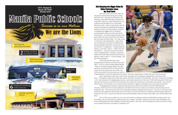 Each year , teams across the state set the goal of reaching Hot Springs and cutting down the nets . Kids grow up shooting in the driveway , dreaming of hitting that big shot to propel their team to a state championship . For Luke Kirk and the Manila Lions , that dream became a reality . Manila captured the class 3A state championship by defeating the Bergman Panthers in a 61-57 overtime thriller , and Kirk hit arguably the biggest shot of the game connecting from half court at the end of the third quarter . That shot would prove big as the game went into overtime and the Lions would pull out a back and forth affair . For Luke , it was a moment he was prepared for , “ I play with a lot of confidence , and Coach Wimberley told me and Brayden ( Nunnally ) to switch positions for the shot ,” he explained . “ I simply shook my head no , and I said , “ I got it .” I didn ' t even see the ball go in . I closed my eyes and for some reason , squatted down , and when I heard the cheers from teammates and the whole town of Manila , I knew it went in . It was amazing ! I still get chills watching it !”