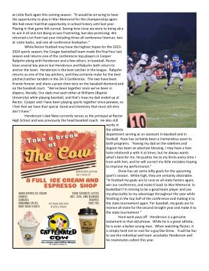 While Rector football may have the highest hopes for the 2023- 2024 sports season , the Cougar basketball team made the final four last season and returns one of the conferences top players in Cooper Rabjohn along with Henderson and a few others . In baseball , Rector loses several key pieces but Henderson and Rabjohn both return to anchor the team . Henderson is the best catcher in the league . Rabjohn returns as one of the top pitchers , and they certainly make for the best pitcher / catcher tandem in the 2A-3 Conference . The two have been friends forever and share a great chemistry on the baseball diamond and on the baseball court . “ We ’ ve been together since we ’ ve been in diapers , literally . Our dads met each other at Williams ( Baptist University ) while playing baseball , and that ’ s how my dad ended up at Rector . Cooper and I have been playing sports together since peewee , so I feel that we have that special bond and chemistry that most athletes don ’ t have .”