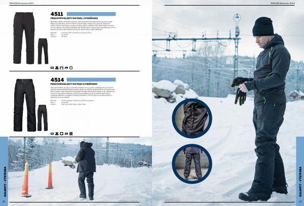 Zateplené kalhoty s bočními kapsami , vnitřní bezpečnostní kapsa na zip na pravé straně . Kapsy na nohavicích , na levé straně rozměrná kapsa s klopou na suchý zip a kapsa na telefon . Vpravo boční kapsy na psací potřeby , papíry a skládací metr . Zadní kapsy , na pravé straně s klopou . D kroužek na předním díle . Nastavitelné v pase pomocí suchého zipu . Vnitřní kapsy k ochraně kolen . Reflexní obruby na nohavicích pro lepší viditelnost .