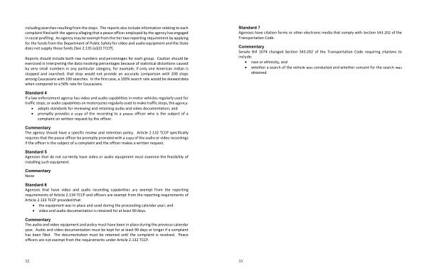 Standard 6 Agencies that have video and audio recording capabilities are exempt from the reporting requirements of Article 2.134 TCCP and officers are exempt from the reporting requirements of Article 2.133 TCCP provided that :