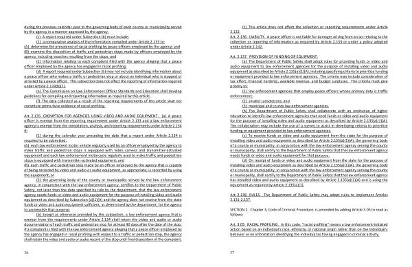 2.132 . Art . 2.136 . LIABILITY . A peace officer is not liable for damages arising from an act relating to the collection or reporting of information as required by Article 2.133 or under a policy adopted under Article 2.132 .