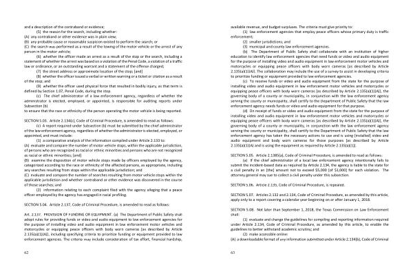 Art . 2.137 . PROVISION OF FUNDING OR EQUIPMENT . ( a ) The Department of Public Safety shall adopt rules for providing funds or video and audio equipment to law enforcement agencies for the purpose of installing video and audio equipment in law enforcement motor vehicles and motorcycles or equipping peace officers with body worn cameras [ as described by Article 2.135 ( a )( 1 )( A )], including specifying criteria to prioritize funding or equipment provided to law enforcement agencies . The criteria may include consideration of tax effort , financial hardship ,