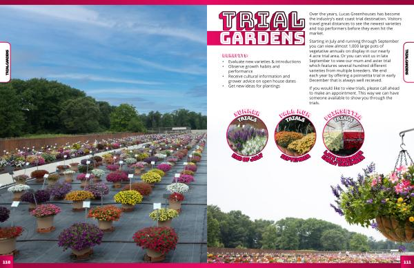 Starting in July and running through September you can view almost 1,000 large pots of vegetative annuals on display in our nearly 4 acre trial area . Or you can visit us in late September to view our mum and aster trial which features several hundred different varieties from multiple breeders . We end each year by offering a poinsettia trial in early December that is always well recieved .
