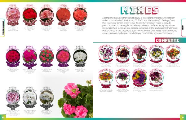 A complementary , designer-blend typically of three plants that grow well together makes up our Confetti ® , Kwik Kombo TM , Trixi TM , and Mix Masters TM offerings . Once they reach your garden center in our # 6 pot , they are ready-made to provide your customers something for virtually any palette or preference they might have . Encourage them to replant into baskets , containers , or the landscape for that instant beauty and color that they crave . Each mix has been trialed across North America to ensure optimum performance and ultimate compatibility between components .