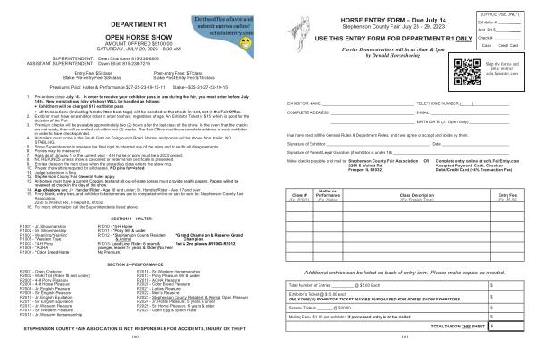 STABLING . 5 . Show Superintendents reserves the final right to interpret any of the rules and to settle all disagreements . 6 . Ponies may be measured . 7 . Ages as of January 1 of the current year - 4-H horse or pony must be a 2023 project . 8 . NO REFUNDS unless show is cancelled or veterinarian certificate is presented . 9 . Entries close on the next class when the preceding class enters the show ring . 10 . Proper show attire required for all classes . NO pins furnished . 11 . Judge ’ s decision is final . 12 . Stephenson County Fair General Rules apply . 13 . All horses must have a current Coggins test and all out-of-state horses must provide health papers . Papers willed be reviewed at check-in the day of the show . 14 . Age divisions are : Jr . Handler / Rider - Age 16 and under ; Sr . Handler / Rider - Age 17 and over . 15 . Entry blank , entry fees , and exhibitor tickets monies are to completed online or can be sent to : Stephenson County Fair Association , 2250 S . Walnut Rd ., Freeport IL 61032 .