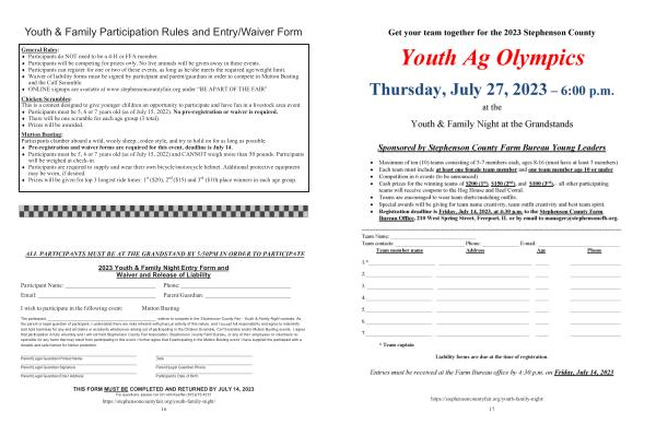 THIS FORM MUST BE COMPLETED AND RETURNED BY JULY 14 , 2023 For questions , please call Christin Keeffer ( 815 ) 275-4331 https :// stephensoncountyfair . org / youth-family-night / 16