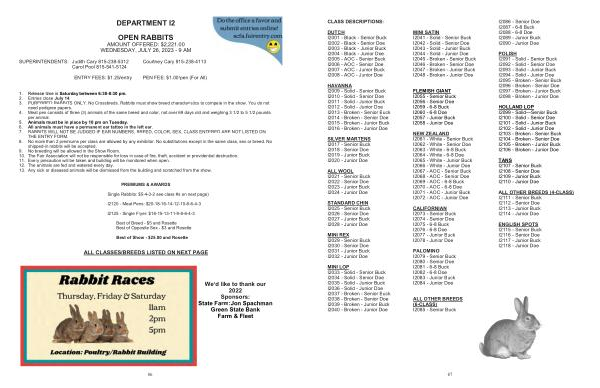 PREMIUMS & AWARDS Single Rabbits : $ 5-4-3-2 see class # s on next page ) I2120 - Meat Pens : $ 20-18-16-14-12-10-8-6-4-3 I2125 - Single Fryer : $ 18-15-13-11-9-8-6-4-3