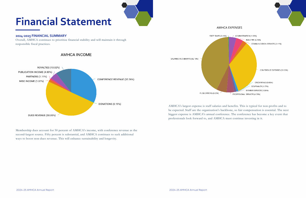 Membership dues account for 50 percent of AMHCA ' s income, with conference revenue as the second-largest source. Fifty percent is substantial, and AMHCA continues to seek additional ways to boost non-dues revenue. This will enhance sustainability and longevity.