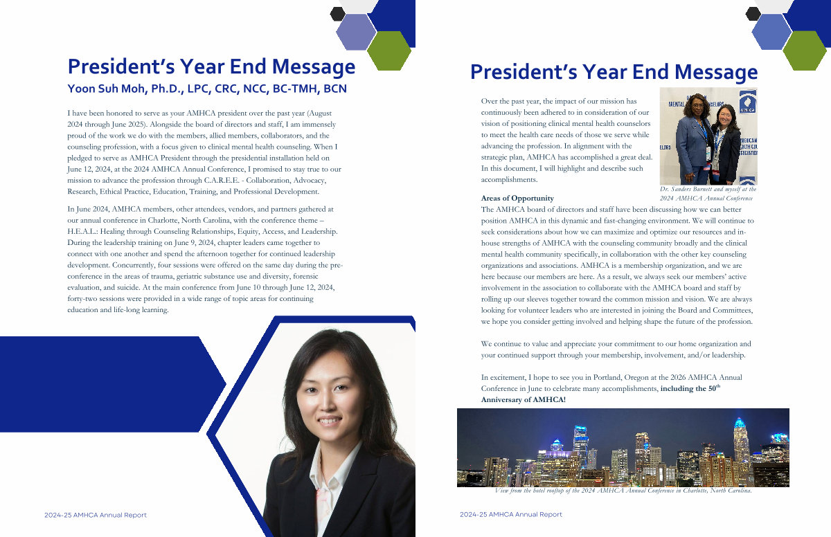 I have been honored to serve as your AMHCA president over the past year( August 2024 through June 2025). Alongside the board of directors and staff, I am immensely proud of the work we do with the members, allied members, collaborators, and the counseling profession, with a focus given to clinical mental health counseling. When I pledged to serve as AMHCA President through the presidential installation held on June 12, 2024, at the 2024 AMHCA Annual Conference, I promised to stay true to our mission to advance the profession through C. A. R. E. E.- Collaboration, Advocacy, Research, Ethical Practice, Education, Training, and Professional Development.