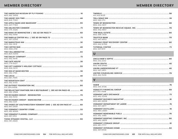 THE SHIRES OF SOUTHWESTERN VERMONT DMO | SEE AD ON PAGE 47 ............ 89 802.447.2456