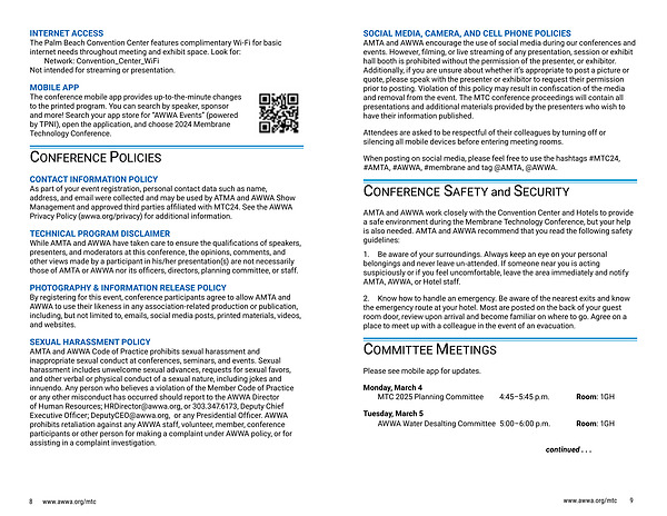 SOCIAL MEDIA , CAMERA , AND CELL PHONE POLICIES AMTA and AWWA encourage the use of social media during our conferences and events . However , filming , or live streaming of any presentation , session or exhibit hall booth is prohibited without the permission of the presenter , or exhibitor . Additionally , if you are unsure about whether it ’ s appropriate to post a picture or quote , please speak with the presenter or exhibitor to request their permission prior to posting . Violation of this policy may result in confiscation of the media and removal from the event . The MTC conference proceedings will contain all presentations and additional materials provided by the presenters who wish to have their information published .