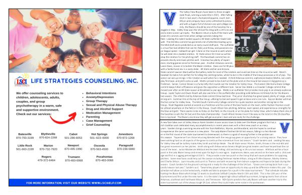A new face takes over at Valley View as Karen Sanders moves across town to take over the Blazer program that has a rich tradition and celebrated many accomplishments in recent years even with a third new coach in as many years . Sanders brings a winning resume with her from Nettleton , Wynne , and Brookland , and she hopes to continue to experience the same successes in a new place . The Lady Blazers finished 18-10 last season , falling in a heartbreaker in the first round of the state tournament to Greenwood , so there is a goal of moving further in the postseason this season . “ Experience from those returning blended with the new group gives an opportunity for a strong season . They have been working hard on all aspects of the game to continue the momentum from last season ,” Coach Sanders said . Leading the way for Valley View will be battery mates Riley Smith and Ashlyn Beale . The All-State senior Pitcher , Smith , throws in the mid-60s and has great movement on her pitches . Smith along with fellow senior Amera Wright are great leaders and have helped lead the culture of the team . Junior Mackenzie Whitlock led the team hitting . 410 and driving in 29 runs last season . Whitlock will be a focal point in the Lady Blazer lineup and relied upon for big hits once again . Sophomore , Beale , was second on the team with a . 354 average and first in slugging percentage at 0.671 . They provide a one-two punch in the lineup that will cause problems for opposing pitchers . Some new faces could help out this season including freshman Harlee Allison , along with Ellie Dawson , Marley Greeno , and Charlie Wilson . Layni Housley and Lynnli Jo Thomas are both recovering from labrum surgeries and hope to be back during the season . Coach Sanders hit the ground running and is ready for the challenge of the 5A East . “ Great core coming back from a successful season last year ,” Sanders said . “ Several key players have an opportunity to step up and be difference makers this year . Our schedule will allow us to be tested early , middle and late to prepare for a push in the state tournament .” That schedule includes hosting the Blazer Blast which brings 53 teams to Southside Softball Complex March 15th and 16th . This is the 13th year of the tournament and first under the new name . It is the state ’ s largest high school softball tournament , bringing teams from all over Arkansas , southeast and northwest Missouri , and Tennessee . NEA Sports predicts the Lady Blazers will earn another trip to the state tournament out of the always tough 5A East , where they could make some noise in the postseason .