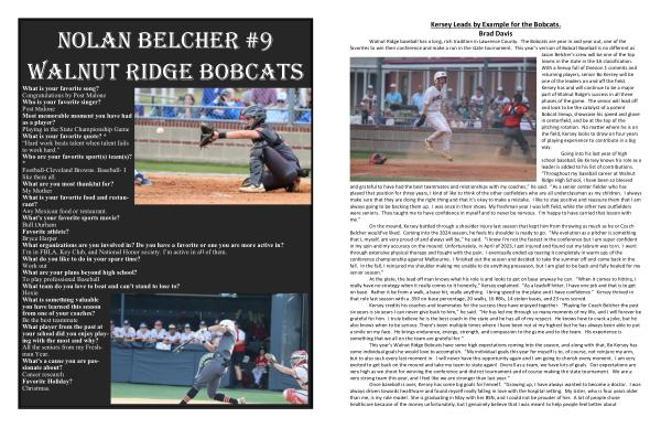 Kersey Leads by Example for the Bobcats . Brad Davis Walnut Ridge baseball has a long , rich tradition in Lawrence County . The Bobcats are year in and year out , one of the favorites to win their conference and make a run in the state tournament . This year ’ s version of Bobcat Baseball is no different as Jason Belcher ’ s crew will be one of the top teams in the state in the 3A classification . With a lineup full of Division 1 commits and returning players , senior Bo Kersey will be one of the leaders on and off the field . Kersey has and will continue to be a major part of Walnut Ridge ’ s success in all three phases of the game . The senior will lead off and look to be the catalyst of a potent Bobcat lineup , showcase his speed and glove in centerfield , and be at the top of the pitching rotation . No matter where he is on the field , Kersey looks to draw on four years of playing experience to contribute in a big way .
