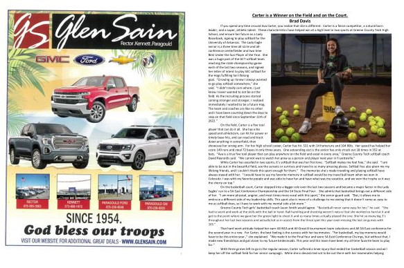If you spend any time around Ava Carter , you realize that she is different . Carter is a fierce competitor , a natural born leader , and a super , athletic talent . These characteristics have helped win at a high level in two sports at Greene County Tech High School , and ensure her future as a Lady Razorback , signing to play softball for the University of Arkansas . The Lady Eagle senior is a three time all-state and allconference centerfielder and two time Best Under the Sun Player of the Year . She was a huge part of the GCT softball team reaching the state championship game each of the last two seasons , and signed her letter of intent to play SEC softball for the Hogs fulfilling her lifelong goal . “ Growing up I knew I always wanted to go play softball somewhere ,” she said . “ I didn ' t really care where , I just knew I never wanted to not be on the field . As the recruiting process started coming stronger and stronger , I realized immediately I wanted to be a future Hog . The team and coaches are like no other and I have been counting down the days to step on that field since September 11th of 2022 .”
