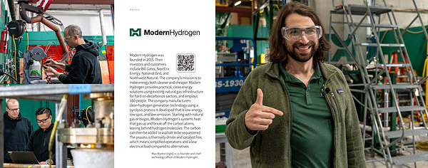 Modern Hydrogen was founded in 2015. Their investors and customers include Bill Gates, NextEra Energy, National Grid, and Northwest Natural. The company’ s mission is to make energy both cleaner and cheaper. Modern Hydrogen provides practical, clean energy solutions using existing natural gas infrastructure for hard-to-decarbonize sectors, and employs 100 people. The company manufacturers clean hydrogen generation technology using a pyrolysis process it developed that is low-energy, low-cost, and low-emission. Starting with natural gas or biogas, Modern Hydrogen’ s systems heat that gas up and break off the carbon atoms, leaving behind hydrogen molecules. The carbon can then be added to asphalt to be sequestered. The process is thermally driven and catalyst free, which means simplified operations and a low electrical load compared to alternatives.