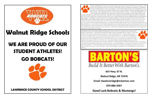 The Walnut Ridge Bobcats earned a trip to the regional tournament last season finishing 14-13 on the year . With only one returning starter and a new conference , Coach Blake Coffman is hoping his young guys come along fast in hopes of making another run into the postseason . Senior Collin Andrews returns to the starting lineup . A two year starter at center , Andrews dominates the boards and is tough to handle in the paint averaging a double , double last season . Some other guys will have to learn some new roles this season . Junior Jersey Cunningham was one of the Bobcats best defenders last season and is tough in the transition game . Senior Caleb Roark is a spot shooter that brings an outside threat to the lineup . Sophomore Trevor Augustine will be another big body tough to handle down low . The 6 ’ 4 , 290 pound center moves like a guard and can score . He and Andrews on the floor together pose quite a challenge for opposing teams . Jace Blake is a sophomore who is an exceptional athlete that will make an impact on both ends of the floor for Walnut Ridge . Coach Coffman feels his team can make some noise moving into the 3A-3 conference . “ Our key to success will be having to hit open shots when we have them ,” he said . We are so big inside that teams will have to double team our post players . If our guards hit shots , we will be tough to beat . Our weakness will be playing with kids that do not have much high school basketball experience .” Coach Coffman and the Walnut Ridge Bobcats are hoping those players gain the needed experience early in the season and are ready come tournament time . With the size they possess in the middle , and the athleticism they have on the perimeter , the Bobcats could be a problem for those in the 3A-3 . Look for Walnut Ridge to make their presence felt in a new league and compete for a regional berth once again .