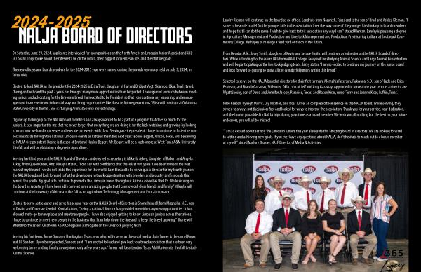 From Decatur , Ark ., Jacey Smith , daughter of Kevin and Jacque Smith , will continue as a director on the NALJA board of directors . While attending Northeastern Oklahoma A & M College , Jacey will be studying Animal Science and Large Animal Reproduction and will be participating on the livestock judging team . Jacey states , “ I am so excited to continue my journey on the junior board and look forward to getting to know all the wonderful juniors within this breed .”