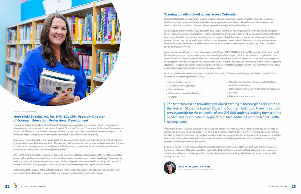 Shandra Kight, MSN, RN, CPN, Associate Clinical Manager in Children’ s Colorado’ s Special Care Clinic, brought forward this philosophy. Kight introduced human-centered leadership in response to the intense pressures and stressors nurse leaders face in today’ s post-pandemic healthcare landscape. Her goal was to support nurse leaders in reconnecting with themselves and relearning the importance of self-care, which in turn positions them as stronger leaders for their teams. Guided by Kight’ s leadership and insight as a clinical nurse at the time she introduced this model, the humancentered leadership framework was steadfastly embraced by the PCS leadership team with implementation led by Kathie Seerup, MSHA, BSN, RN, NE-BC, Senior Vice President, Chief Nursing and Operations Officer, and Kirtley Ceballos, MSN, RN, CNS, NEA-BC, Director Patient Care Services, Maternal / Fetal & Neonatal.