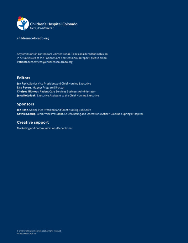 Any omissions in content are unintentional. To be considered for inclusion in future issues of the Patient Care Services annual report, please email PatientCareServices @ childrenscolorado. org.