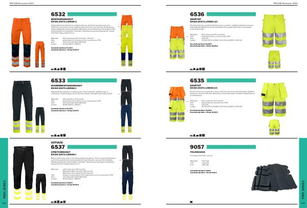 Helppohoitoisesta polyesteri-puuvillasekoitteesta valmistetut huomiohousut , jotka säilyttävät muotonsa ja värinsä . Läpälliset takataskut , joissa tarrakiinnitys . Reisitaskuissa paikat puhelimelle , kynille ja työkaluille . Mittatasku , jossa puukkonappi . Polvisuojat voidaan säätää kahdelle eri korkeudelle . Vahvikkeet mittataskussa ja polvisuojataskuissa . Kokoja C42-C64 voidaan pidentää 5 cm .