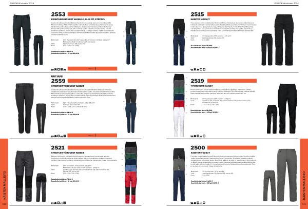 Kevyet työhousut , joissa moderni leikkaus , reisitaskut ja läpälliset takataskut . Oikean puolen taskuun saa kätevästi kynät ja työkalut . Kokojen C32 – C50 pituutta voidaan säätää . Ratkomalla lahkeensuiden punaiset ompeleet lahkeita voidaan pidentää 5 cm .
